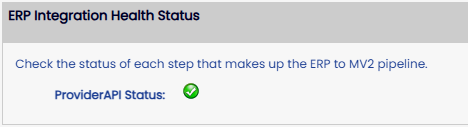 A status of an icon with a green circle with a checkmark indicates the communication between MV2 and the Provider API are working as intended and ultimately the communication between MV2 and Business Central is functioning also.