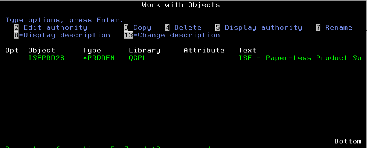 WRKOBJ OBJ(QGPL/ISEPRDxy) OBJTYPE(*PRDDFN)